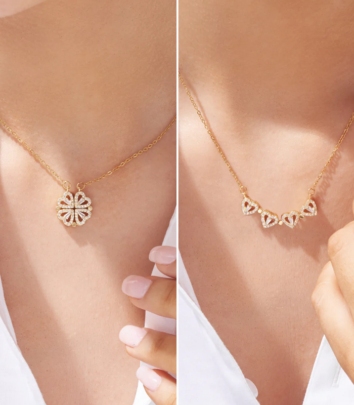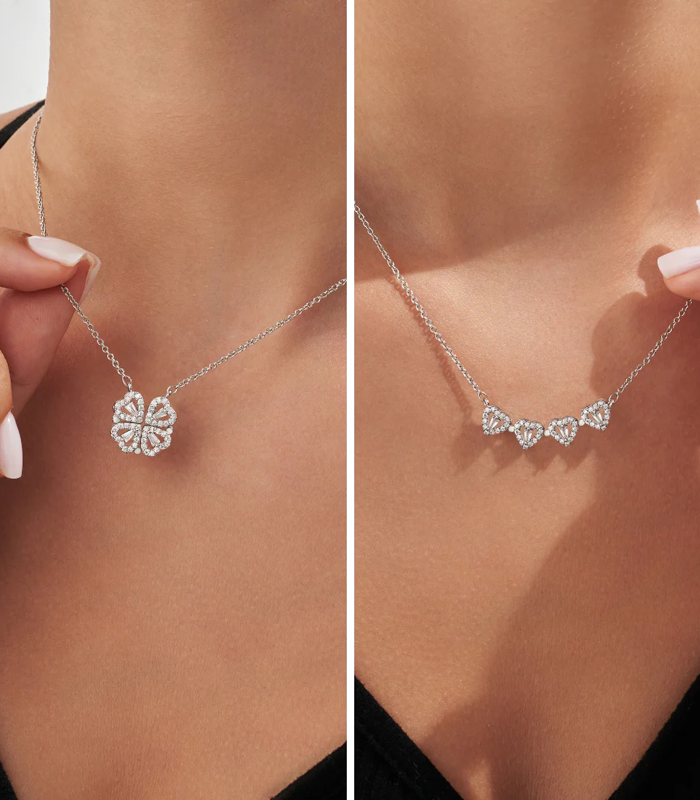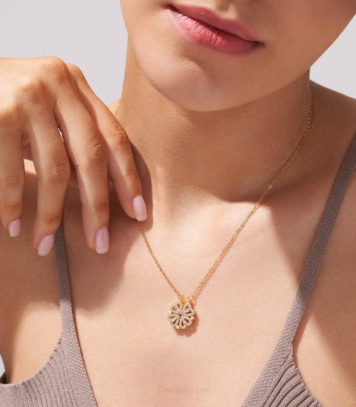 Açılabilir mıknatıslı yonca kolye aşk ve şansı temsil eden bir kolyedir. Gerçek gümüş ve altın rengi parlak zinciri ve açılabilir yapısıyla cazibenize ışıltı katacak.